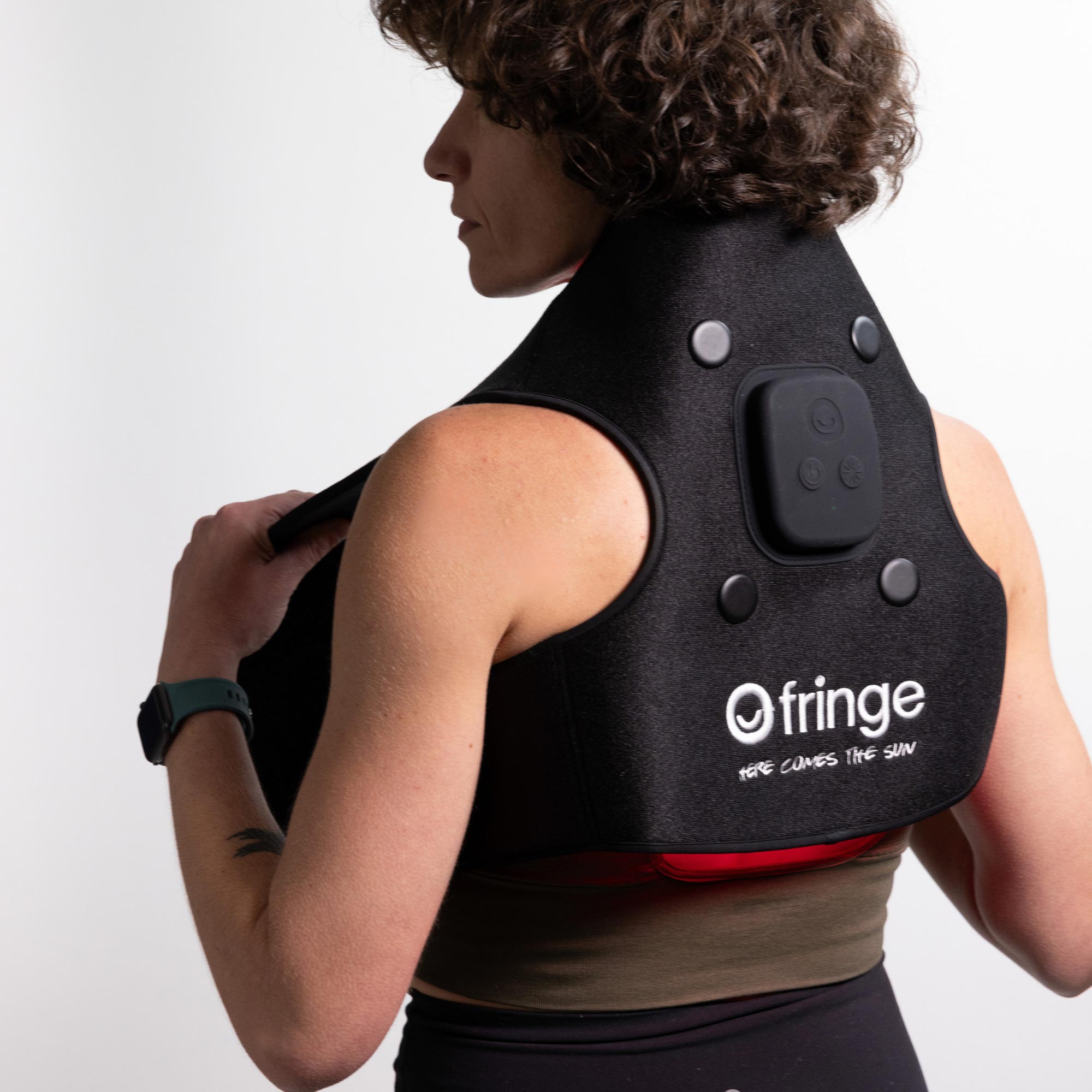 The Fringe Neck and Shoulder Red Light Therapy Wrap combines light wavelengths of red light (660nm) and near infrared light (850nm) and an optional vibration massage setting.