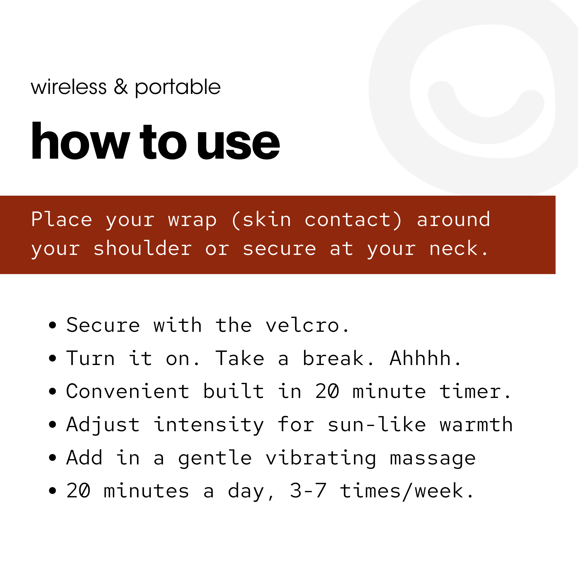 It wraps up your shoulder and neck area for targeted cellular-healing, as well as potential pain and inflammation reduction. This ergonomic, wireless and versatile therapy wrap contains 360 hard working LED light chips and 4 optional vibration massage areas to provide convenient, comfy, warm, massaging light therapy.